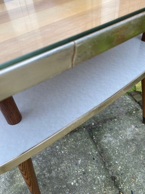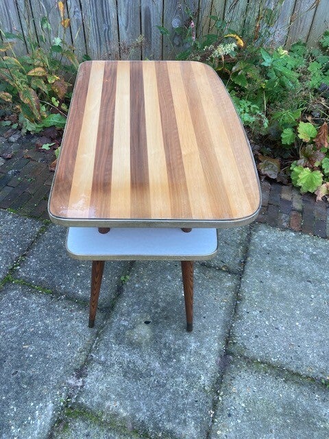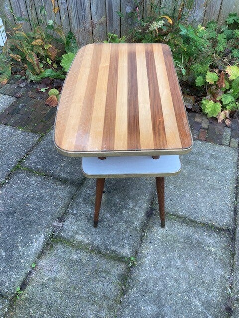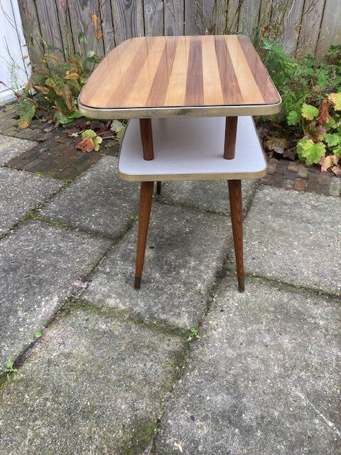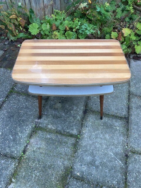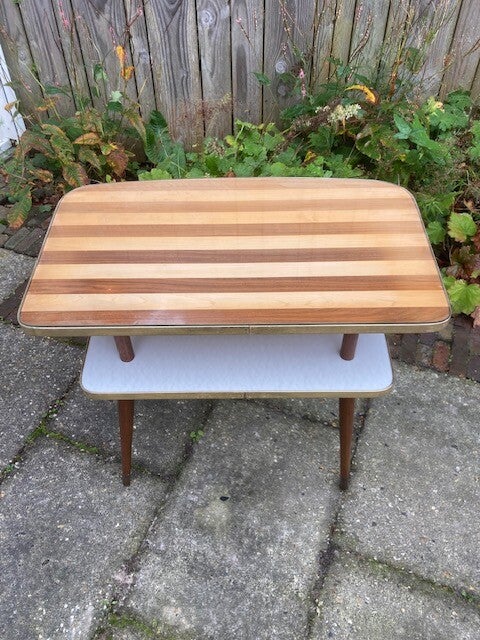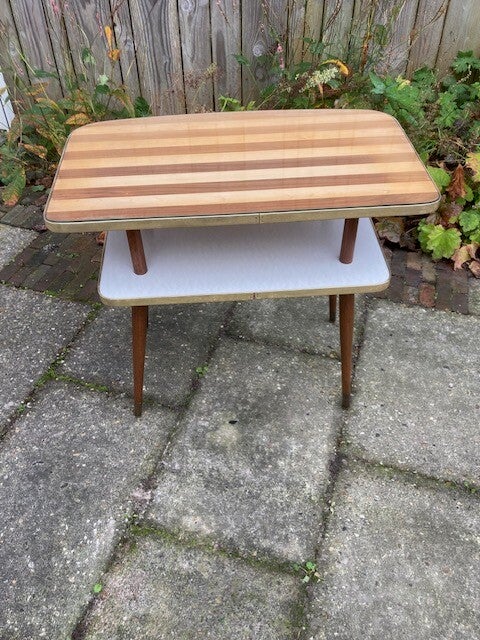 Vintage radio/tv tafel met onder en bovenblad. Bovenblad voorzien van een glasplaat. Tafel is 12-12-1959 geproduceerd, waarschijnlijk in Oost Duitsland. Tafelblad boven 45x73 cm en hoogte 61 cm Tafelblad onder 38x61 cm en hoogte 44 cm Sierlijst van goud/zilver heeft een kleine scheur aan voorzijde Boven blad vertoont enige verkleuring door de zon Verder is de tafel gaaf en in goede conditie