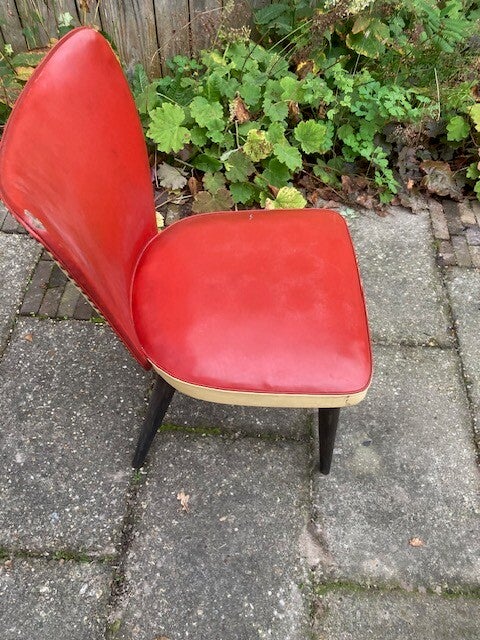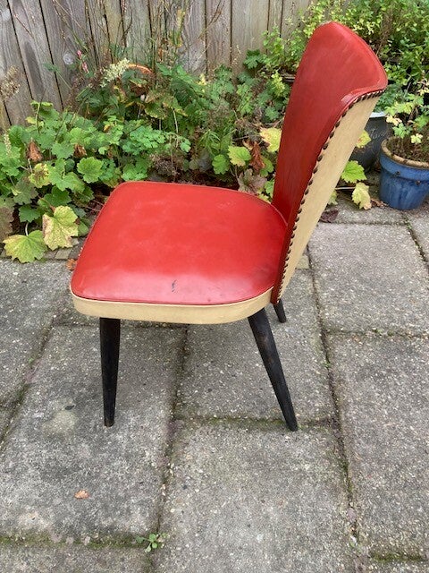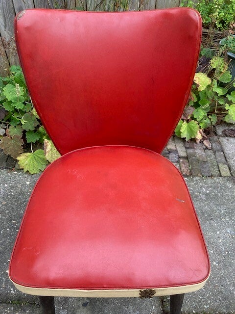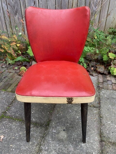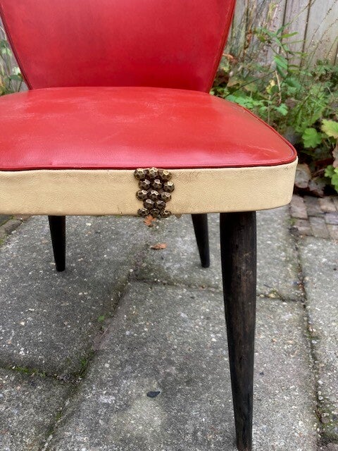 Deze fraaie stoel is met leer bekleed, heeft wel enige gebruikssporen zoals slijtplekken en verkleuring. Een zeer mooie en stevige stoel in mooie uitvoering (rood/beige). De voorzijde van de stoel is op een gedeelte beslagen met meubel nagels.