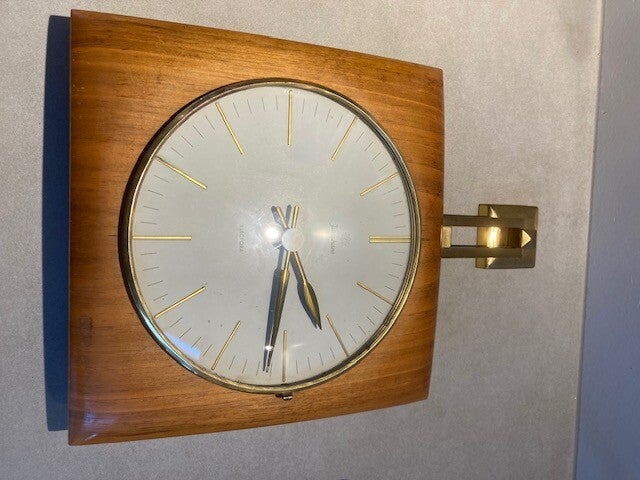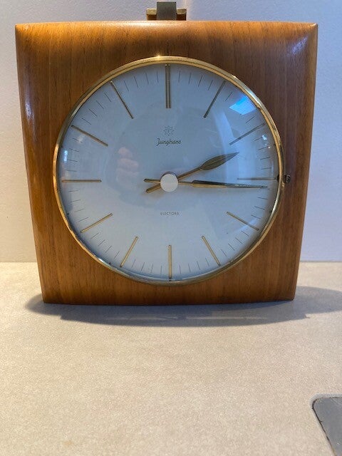 Junghans Electora wandklok. Deze klok heeft een elektrische gedreven uurwerk op batterij. De klok is in goede staat met een goed werkend uurwerk. De klok is voorzien van een houten behuizing met koperkleurige hanger voor aan de muur.