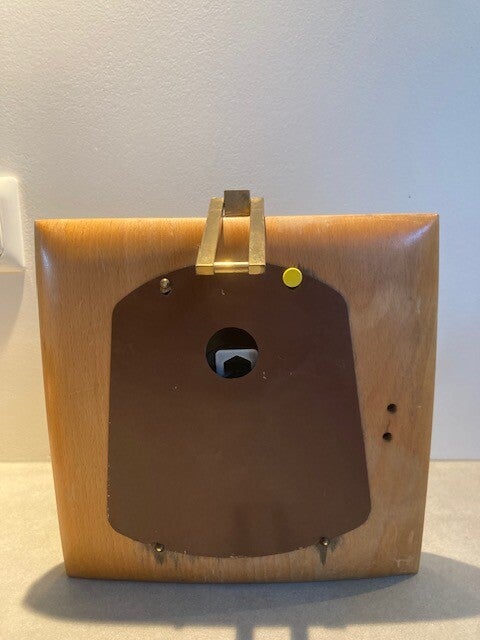 Dee klok heeft lichte verkleuring aan het metaal van het glazen deurtje. en hele kleine krasjes. Aan de achterzijde mist een schroefje van het deksel, deze is vervangen door een punaise. Op het wijzer blad zijn 2 hele kleine lichte vlekjes te zien.