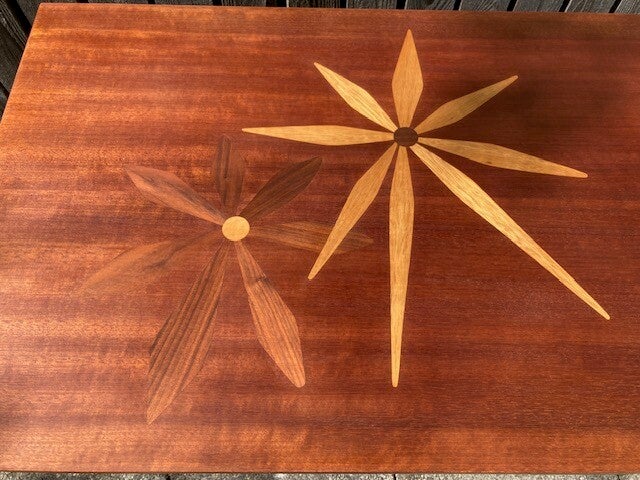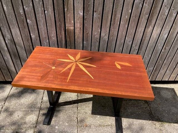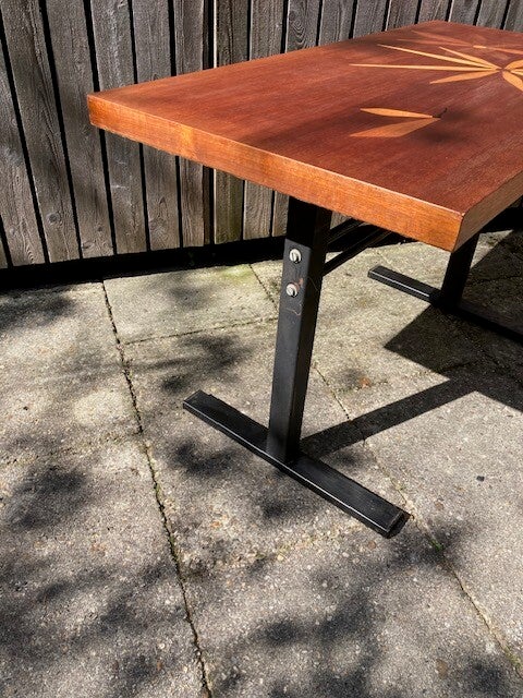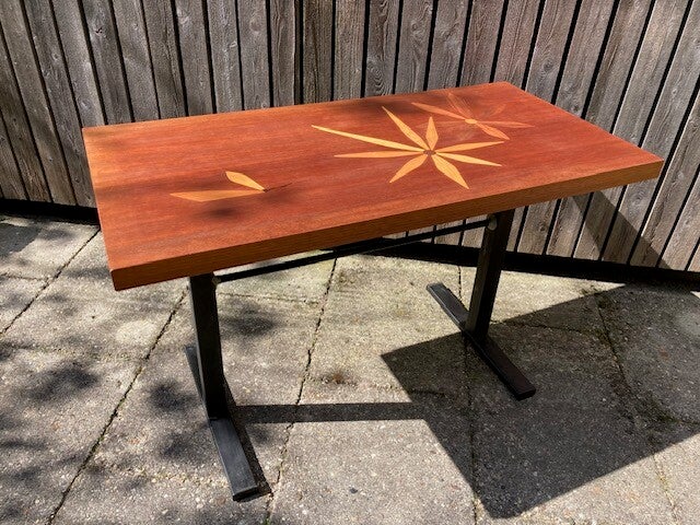Bijzondere vintage tafel uit de jaren zestig. Deze tafel is fraai gedecoreerd met waterlelies en een Libelle. Blad is in uitstekende staat. Er kan nog gekozen worden voor bewerking met olie of lak. Onderstel zwart staal met kleine gebruikssporen.