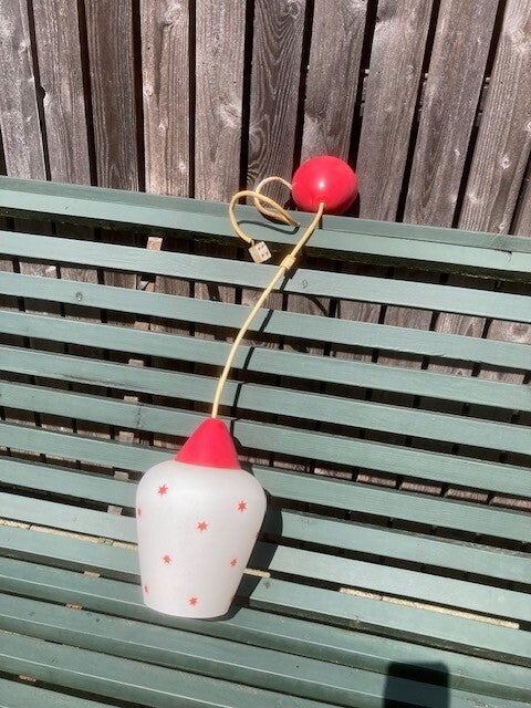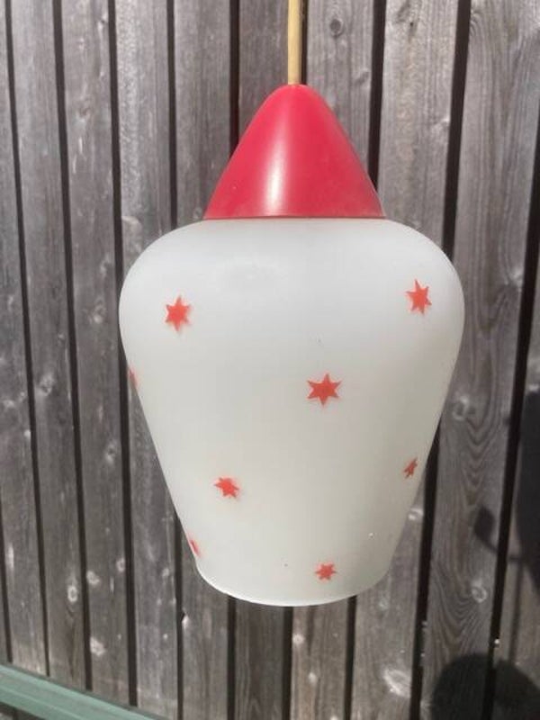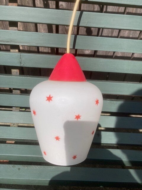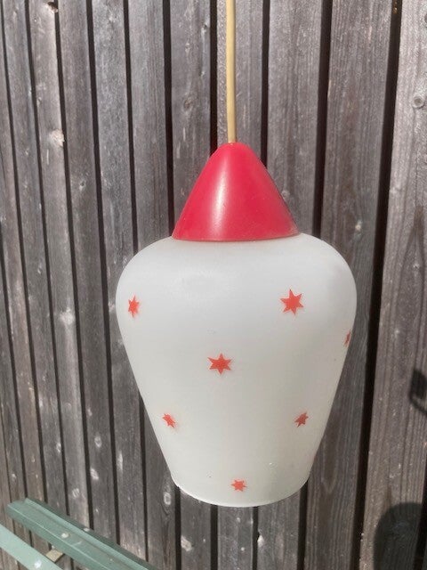 Melk glas vintage hanglamp gedecoreerd met rode sterren