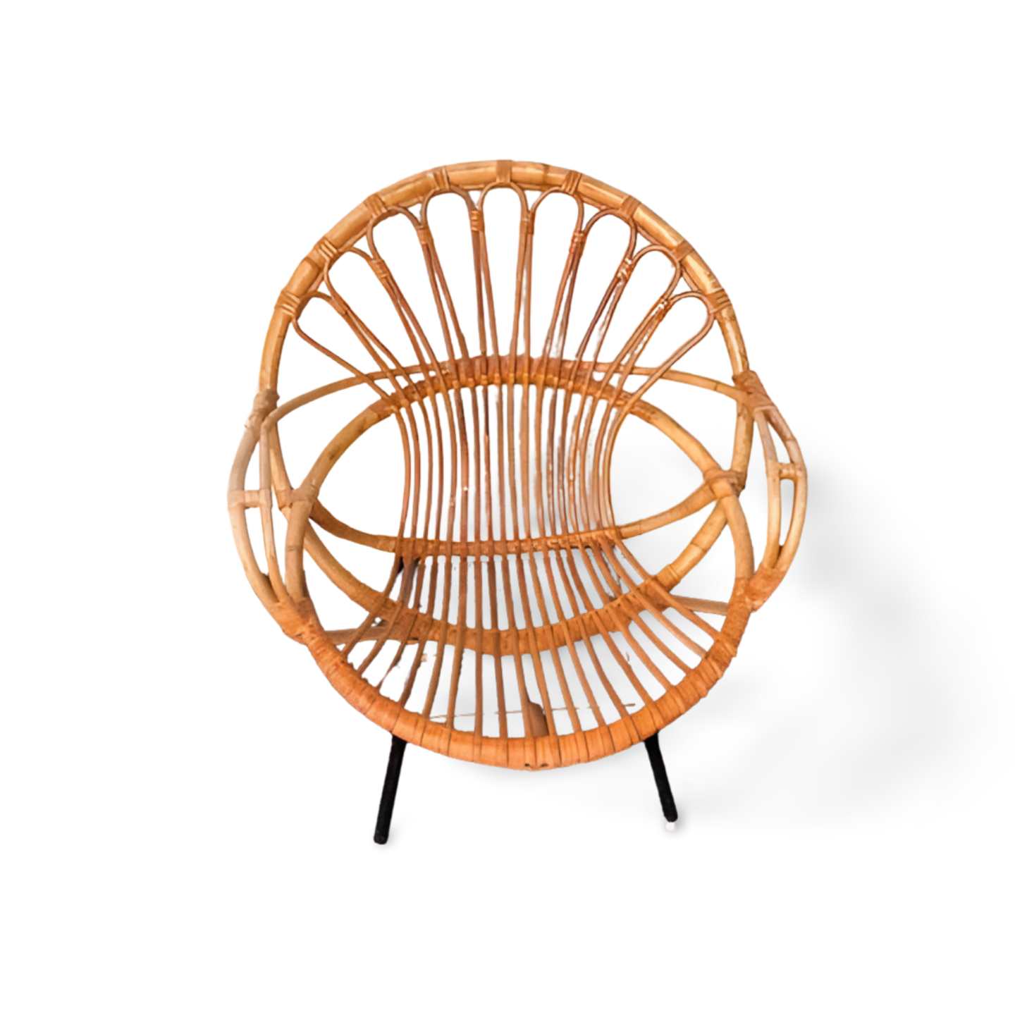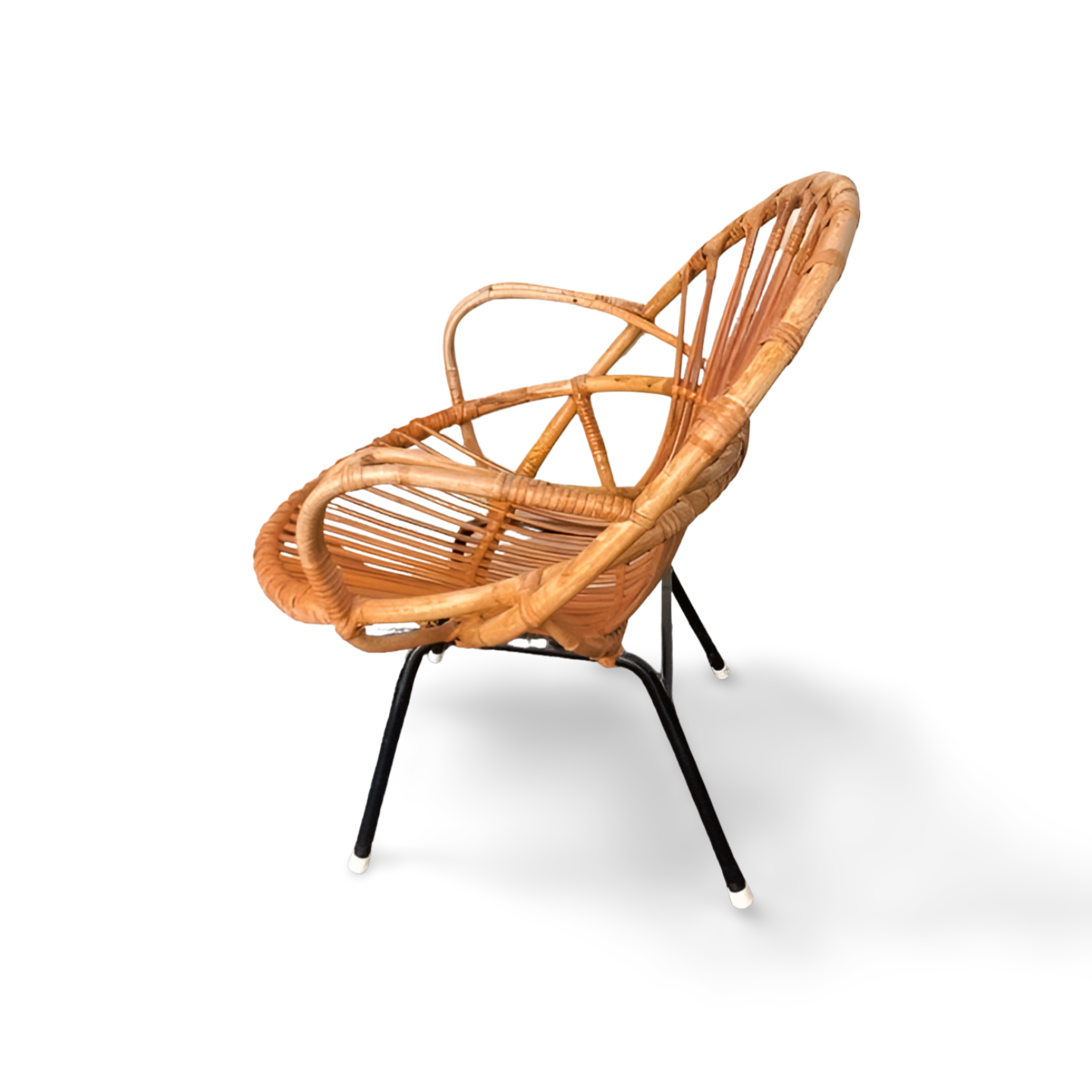 Leuke rotan kuipstoel op zwart stalen frame. Hollandsfabrikaat. 60 cm breed en 65 cm diep