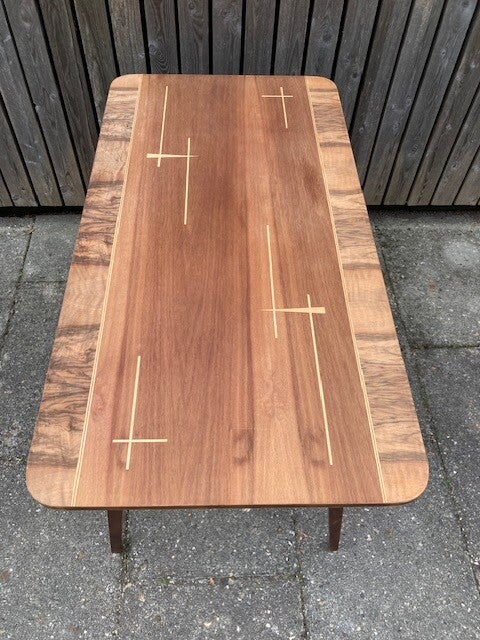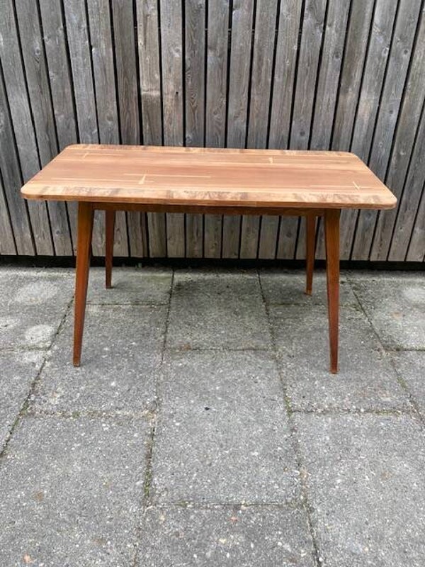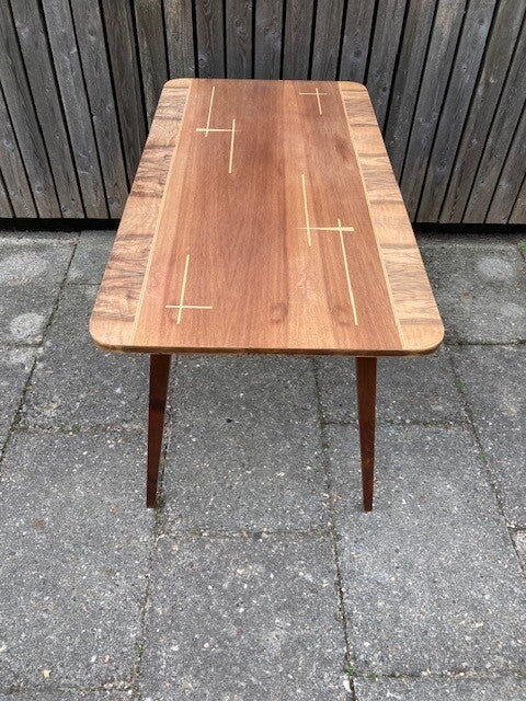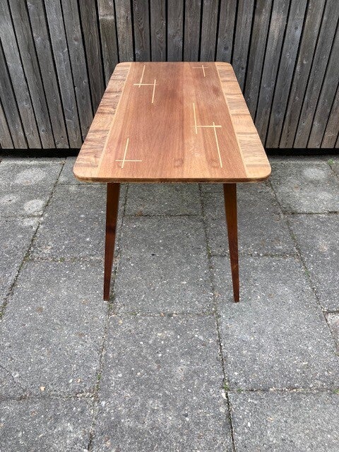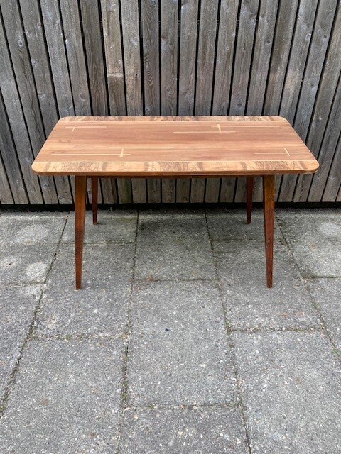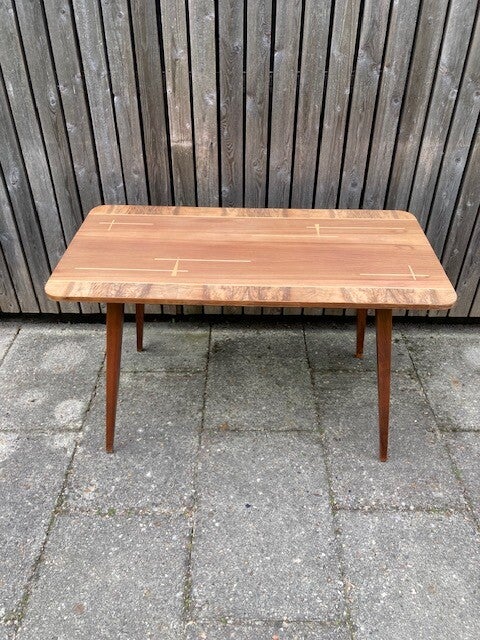 Deze fraaie mid century koffietafel heeft een belegd tafelbald, fraai ingelegd met symetrische figuren. Tafel is zorgvuldig schoongemaakt en weer helemaal klaar voor gebruik. dit is een mooie aanvulling op je interieur als salontafel, platenspeller, drankenbuffet of gewoon achter de bank.