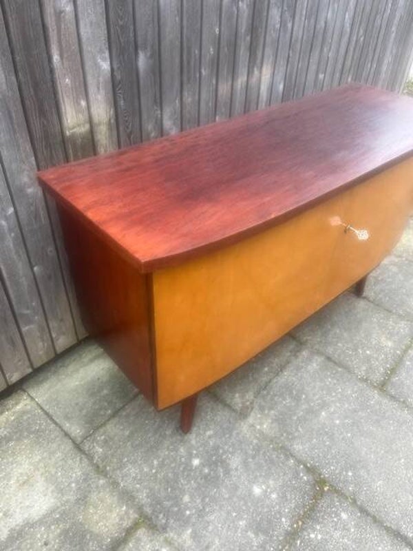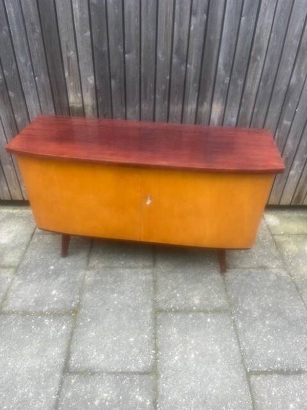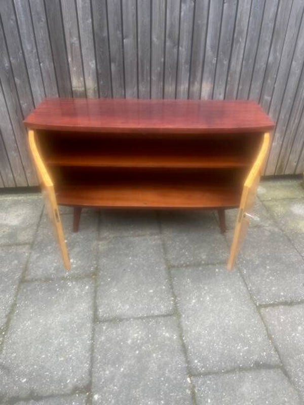 Mooie mid Century dressoir kast met ligt gekleurde deuren. Deuren zijn rond gevormd. Deze dressoirkast is voorzien van een legplank over gehele breedte. Kast is uitgevoerd in donker fineer en staat op 4 fraaie poten. 125x45 cm en 75 cm hoog.