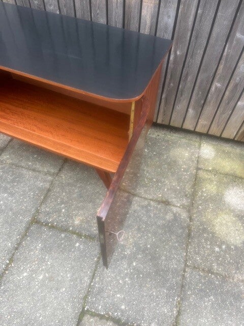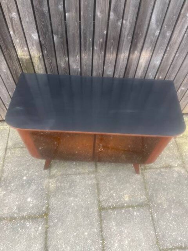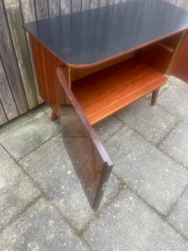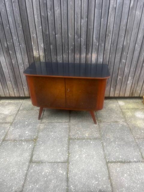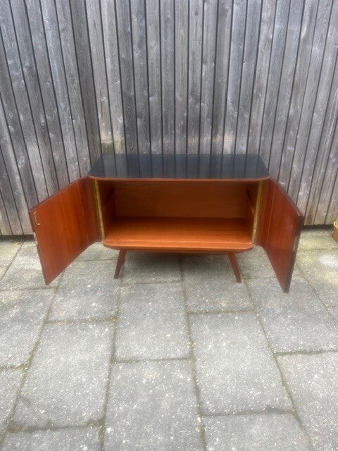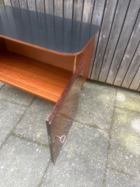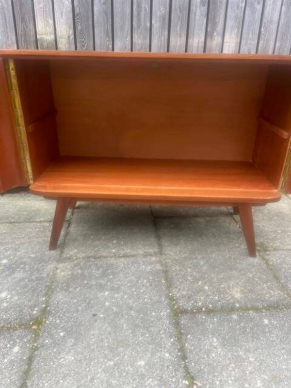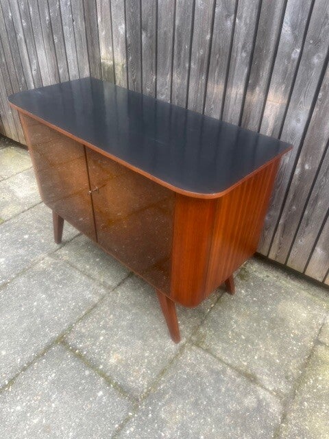 Fraai gevormd dressoir uit jaren 60 met gebogen deuren. Hoogglans fineer in goede staat. Kast heeft geen legplank. Kast staat op vier fraaie jaren 60 voeten. Bovenzijde zwart gelakt. 102x44 cm73 cm hoog.Verzenden is in overleg mogelijk.