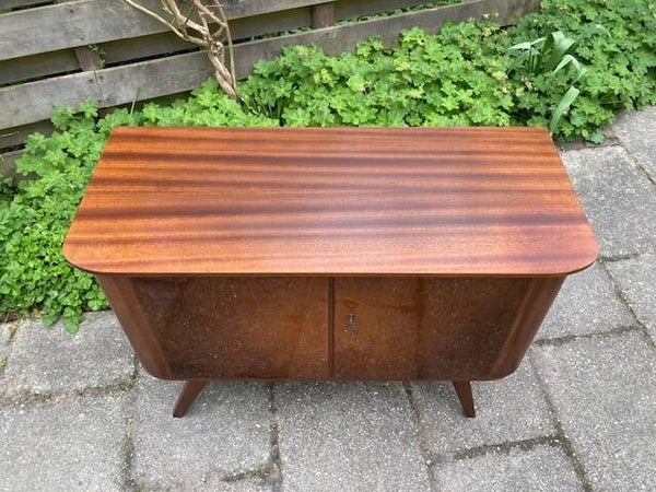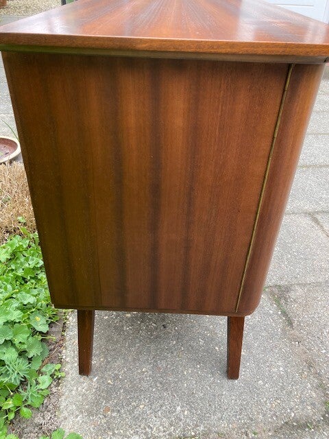 Dressoir jaren 60In goede staatFineer in takt bovenzijde een lichte vlek 10 cm nauwelijks zichtbaarHang en sluitwerk in orde.Fraai gevormde deuren.108x45 cmHoog 73 cmmet legplank