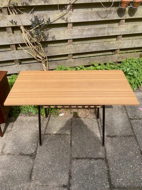 Vintage terrastafel met beige formicablad en legplank onder het tafelblad.Tafel met onder legplank120x60 cmHoog 74 cmOnder plank hoogte 57