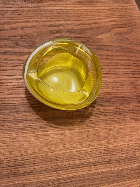 Prachtige vintage asbak of decoratieve schaal van geel glas met een organische vorm en een subtiele witte swirl. Dit stuk is een echte blikvanger en voegt een vleugje retro charme toe aan elk interieur. Perfect voor verzamelaars of als uniek decoratief object.